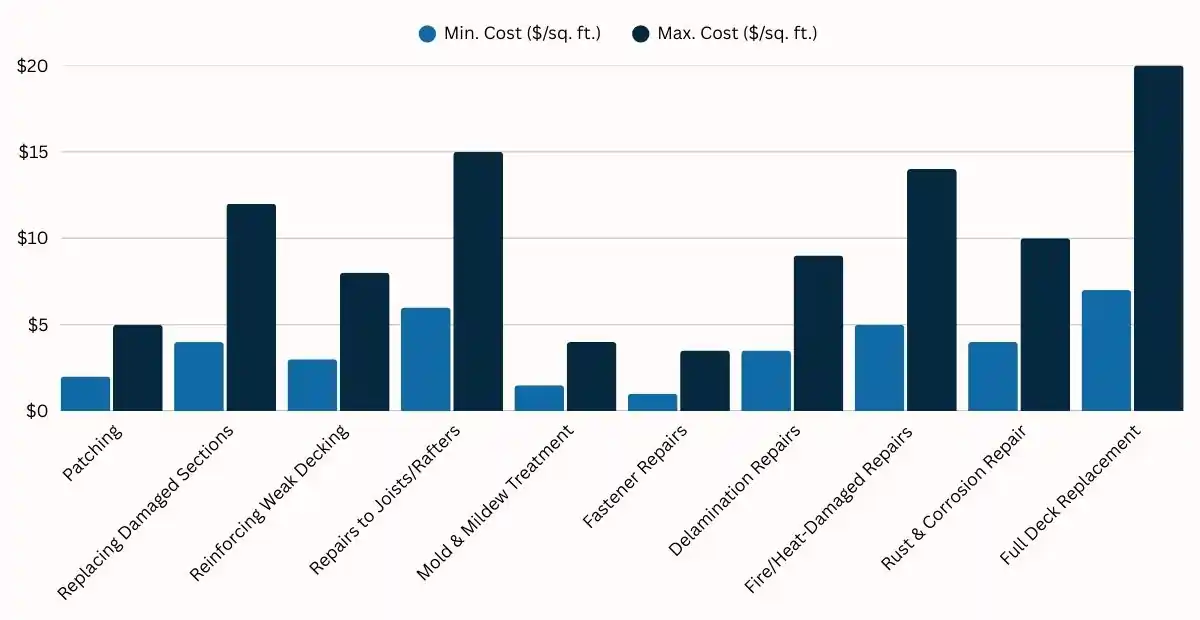 Roof deck repairs can range from minor to major and even complete replacements. Replacing damaged roofs costs much more compared to minor roof repairs. Here's a brief overview of different roof repairs and their costs per square foot: