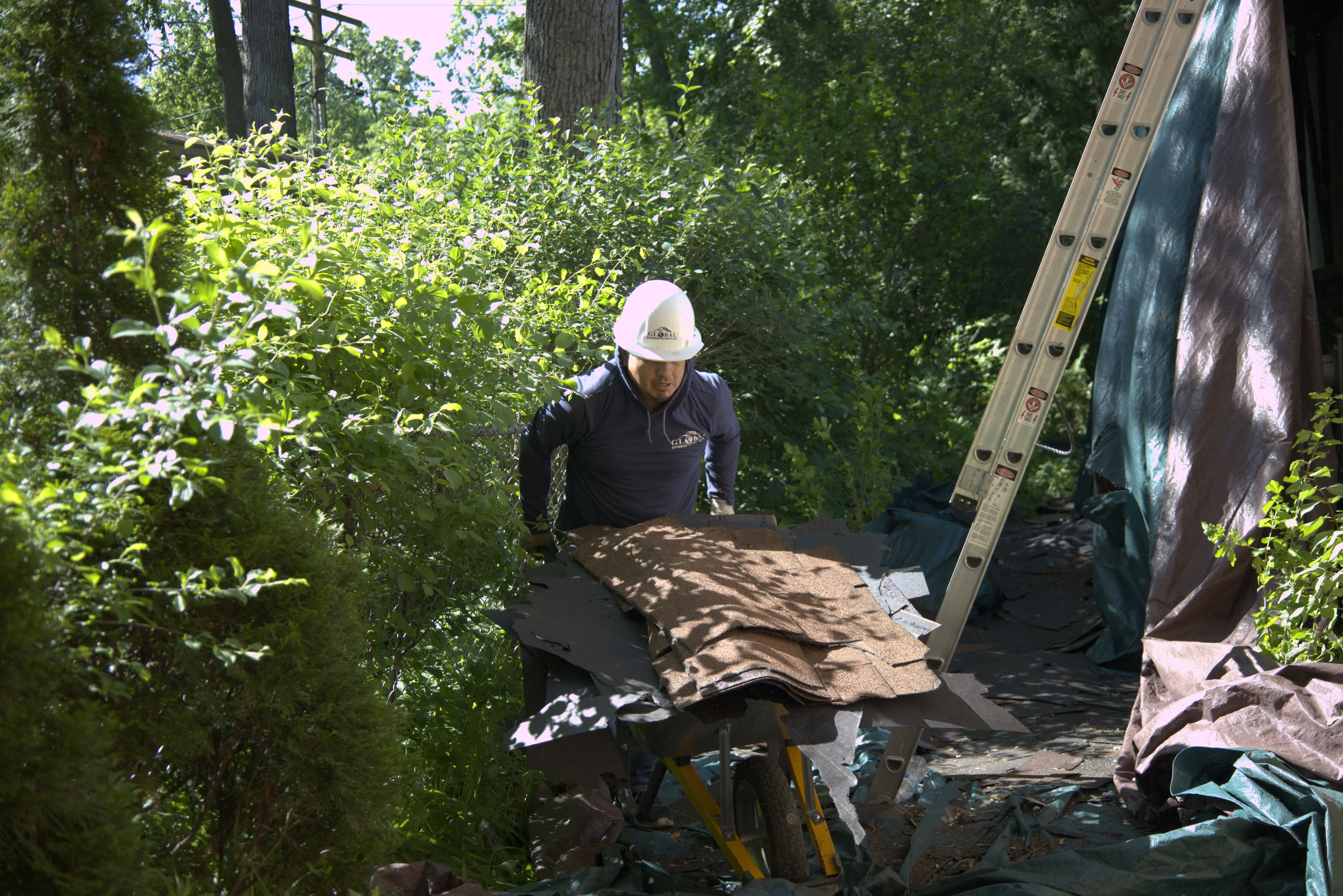 The debris goes into a dump trailer or dumpster positioned close to the house. Shingles are heavy (a typical roof generates 2-3 tons of waste), so positioning matters for safety and efficiency.